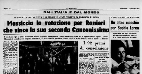 «Dio mio! Ti ringrazio!»: con queste parole Massimo Ranieri ha accolto la notizia della vittoria a «Canzonissima» dietro le quinte del teatro «Delle Vittorie». Ranieri è scoppiato in un pianto dirotto e, sorretto dagli amici, ha singhiozzato poche parole confuse. Ha detto, tra l'altro, che questa è la più bella vittoria della sua vita, dopo un periodo difficile dovuto alla lunga assenza dalle scene per il servizio militare. «Era difficile tornare tra il pubblico — ha continuato Ranieri — dopo un periodo di incertezze. È come se avessi avuto il più bel regalo della mia vita».