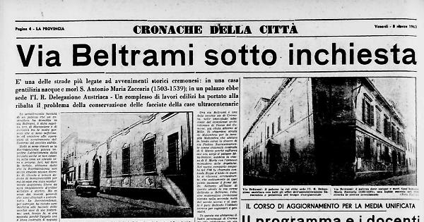 Ma in questa via ebbe a nascere ed a morire anche il Santo Antonio Maria Zaccaria. Queste schematiche notizie storiche possono essere sufficienti a giustificare l'intervento della Sovrintendenza la quale ha già disposto tutto un piano per la conservazione di molte facciate di palazzi e di case della città. È già a buon punto, per esempio, il ripristino del palazzo Anselmi in via Cesare Battisti ore sarà salvata parte della facciata e lo scalone e sono allo studio il salvataggio delle facciate di altri tre palazzi.