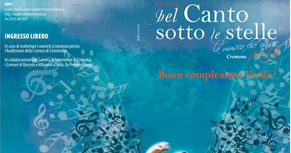 Questa filosofia si esprime nel concerto degliAlti & Bassiin calendario il 2 agosto, per un viaggio senza confini nel mondo della canzone. Il 30 agosto, sull’onda del notevole successo ottenuto lo scorso anno, torneranno i giovani cantanti della Fondazione Luciano Pavarotti, nuove voci per un programma ancora più bello e ambizioso nuovamente sostenuto da Maserati. L’11 settembre uno dei gruppi vocali più amati della città, il Coro Polifonico Cremonese, si metterà in gioco con un programma interamente operistico comprendente anche brani di Wagner, l’altro (bi)centenario del 2013. Dopo il bagno di folla registrato lo scorso anno con la Messa da Requiem, torna a grande richiesta – come si usa dire – il Coro Ponchielli Vertova con un programma ancora imperniato sul Verdi sacro comprendente la giovanile Messa solenne, una vera chicca, il 26 settembre nella splendida cornice della chiesa di Sant’Agostino. Lo stesso ensemble diretto da Patrizia Bernelich chiuderà la rassegna il 10 ottobre, nel 200˚ anniversario della nascita del Maestro, con una originale Notte Verdiana al museo civico Ala Ponzone, una serata che si preannuncia tutta da scoprire e anche da gustare grazie alla collaborazione con la sezione cremonese dell’Accademia Italiana della Cucina.