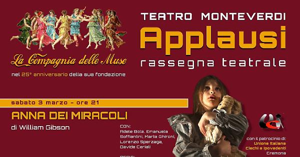 CREMONA - La Compagnia delle Muse, nella ricorrenza del suo 25° anniversario di fondazione presenta la rassegna teatrale Applausi. Il cartellone prevede quattro appuntamenti con spettacoli di propria produzione e tratterà, in questa occasione, anche alcuni temi sociali di estrema rilevanza ed attualità. Gli spettacoli sono in programma al teatro Monteverdi di Cremona alle 21.