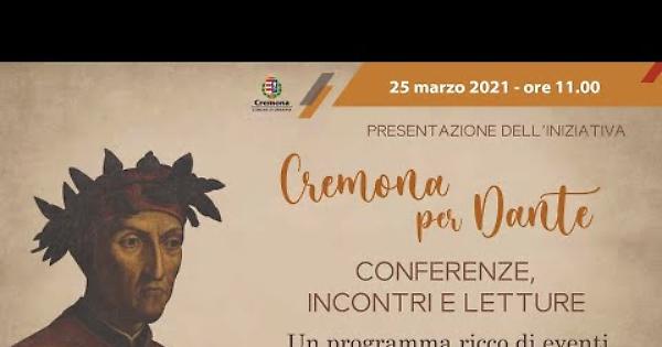 CREMONA (25 marzo 2021) - Conferenza di presentazione del programma di eventi organizzati e promossi da enti e associazioni locali: incontri, conferenze e letture per celebrare Dante nei 700 anni dalla sua scomparsa. Interverranno la Società Storica Cremonese, l'associazione ex alunni del liceo Manin, la Società Dante Alighieri, L'ADAFA, la Biblioteca Statale di Cremona, il Provveditorato di Cremona.